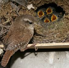 The baby wrens have hatched! It was sometime between Noon and now --- I saw Mama still brooding at lunchtime. I tried to take a video, but nothing's clear in it. That little nest is surprisingly deep, and everyone in it is, of course, varying shades of brown. I saw three open-wide mouths, but heard no chirps. I didn't want to look too long, as Mama was clearly out hunting for food. Here's a picture from the Web to give you an idea, and to tide you over until I'm --- hopefully --- able to provide my own.